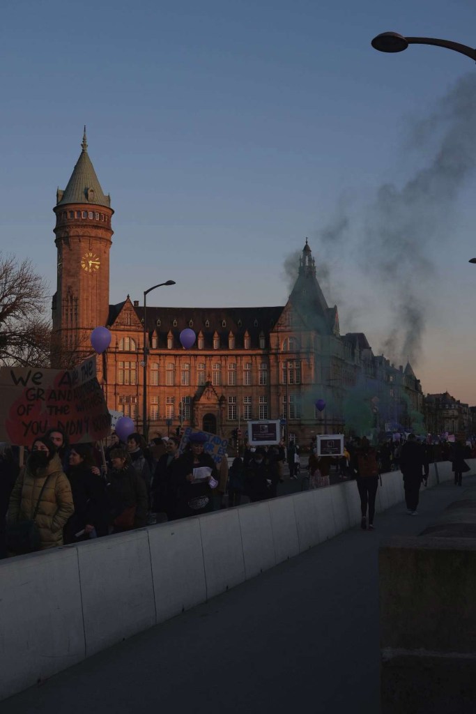 C’est la plateforme Journée Internationale de lutte pour les droits des femmes (JIF), comme ils se décrivent dans leur biographie Instagram, qui organise la marche. Milena Steinmetzer, membre de la Confédération syndicale indépendante du Luxembourg (OGBL), et responsable communication de JIF, explique : « On a cinq grandes revendications : l’égalité salariale, donc que les femmes et les hommes aient le même salaire, mais aussi pour améliorer les conditions liées au temps-partiel, effectué majoritairement par les femmes, ce qui signifie une plus petite pension pour elles en général. Elles gagnent 44% moins en pension que les hommes. Cela veut dire que beaucoup de femmes se retrouvent dans la précarité lorsqu’elles vieillissent.