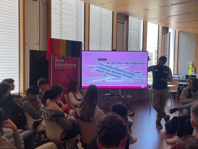 Les deux élèves sont intervenus dans les classes de seconde et troisième avec un membre de l’association Rosa Lëtzebuerg, principale association de défense des droits des personnes LGBTQ+ au Luxembourg. Ces interventions ont pour objectif de rappeler que les LGBTQ-phobies constituent des délits, mais aussi de remettre en cause des préjugés et de lutter contre certains comportements transphobes ou homophobes largement banalisés. En somme, favoriser l’intégration et le respect des élèves LGBTQ+ tout en permettant à chacun de s’informer sur ces sujets pas toujours évidents à aborder en classe ou entre amis. Le bilan de ces interventions semble largement positif aussi bien du côté des intervenants que des élèves. Nathan a ainsi expliqué qu’il se félicitait d’avoir contribué à faire évoluer les mentalités sur le sujet et il s’est également montré agréablement surpris de l’implication des élèves lors des interventions.