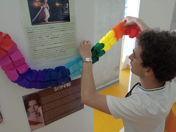 Aborder la question de l’homophobie et de la transphobie semblait donc être une vraie nécessité et attente de la part des élèves. Toutefois, certains ont émis quelques réserves quant à l’efficacité de l’initiative et à l’angle de l’exposition. De nombreux élèves ont trouvé dommage que cette problématique soit abordée seulement durant une semaine et estiment qu’elle devrait davantage rejoindre des sujets de fond qui méritent vigilance et information tout au long de l’année. Un élève de terminale m’a ensuite fait part de sa déception de constater essentiellement des artistes représentés dans l’exposition et déplore le manque de personnalités issues d’autres horizons ou de personnalités plus banales montrant que les luttes pour les droits des LGBTQ+ se jouent aussi au quotidien. Nathan a répondu à ce constat en me glissant que ces personnalités devaient davantage être vues comme des figures d’exemples non exhaustives auxquelles les personnes LGBTQ+ doivent en grande partie leurs droits, pourtant toujours trop partiels et inégaux selon les pays et les conditions, il a ensuite ajouté qu’il ne fallait pas oublier que « les personnes ayant le plus milité pour nos droits proviennent du milieu de l’art et du spectacle. »