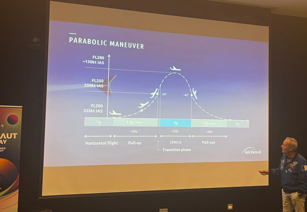 Jean François Clervoy explique qu’à bord de l’avion nous sommes en conditions normales d’apesanteur terrestre, 1 G, avant de basculer sur de l’hyper gravité, 1,8 G, pendant 20 secondes, l’avion prend alors une trajectoire ascendante quasiment verticale. La sensation est semblable à celle ressentie par les astronautes au décollage de la fusée, notre corps nous semble peser alors presque deux fois plus lourd. La phase suivante est la zéro G, sensation vécue uniquement par les astronautes dans l’espace, ou sur Mars (0,38 G) ou sur la Lune (0,16 G). C’est durant ces 25 secondes que nous ne sentons plus notre poids, nous volons. L’avion est alors plus ou moins en «chute libre» actionnée par les 3 pilotes qui agissent simultanément. L’avion prend ensuite une trajectoire descendante quasiment verticale, il y a de l’hyper gravité soit 1,8 G pendant 20 secondes de nouveau. Au retour sur Terre, on ressent la gravité terrestre (1 G). L’ensemble de ces phases est appelé parabole du fait de la trajectoire que prend de l’avion. Elle sont répétées 15 fois, cela constitue le vol parabolique.