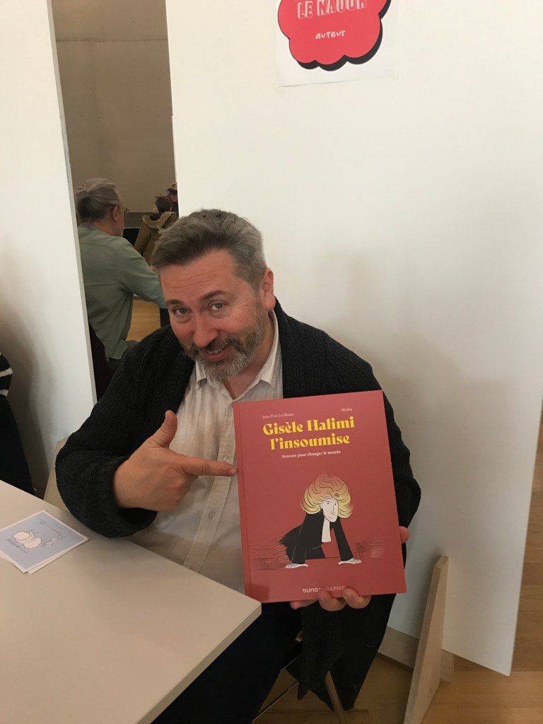 Gisèle Halimi est une personnalité éclairante. C’est la grande stratège du féminisme. C’est elle qui a en défini les objectifs et les moyens tactiques pour y parvenir avec, par exemple, ses procès très médiatiques. Gisèle Halimi a mené la révolution féministe, celle de l’émancipation des femmes, d’une façon pacifique et non violente qui a transformé le XXe siècle et nos sociétés. Cette grande révolution qui est au service d’une société d’égalité, concerne autant les hommes que les femmes. Gisèle Halimi disait en effet : « Qui déplace la place des femmes, déplace la place des hommes. ». Pour schématiser, auparavant, on était dans une société pyramidale avec une domination des hommes, au sein du couple, dans la famille avec le « chef de famille », comme on disait jusque dans les années 1970. Aujourd’hui, on est dans une société plus horizontale avec le partage des responsabilités, des décisions au sein du couple. L’idée est que le couple doit être fondé, comme la société, sur un respect mutuel et sur l’amour, non plus sur la domination. Finalement, n’est-ce pas une meilleure société ? Les hommes n’en profitent-ils pas tout autant que les femmes ? Mais les combats sont-ils terminés ? Non, ils ne le sont pas, il y aura toujours des combats à mener. C’était d’ailleurs le dernier message de Gisèle Halimi, elle qui avait tant combattu pendant sa vie. À la fin, elle donnait des conférences, écrivait des ouvrages et notamment un livre : Ne vous résignez jamais. C’est-à-dire, n’acceptez pas ce monde tel qu’il est parce que ce monde est laid, il est injuste. Même si en Europe Occidentale, on est dans une situation, au moins sur le plan légal, d’égalité, le monde est laid, le monde est injuste. Alors ne vous résignez pas à cet état parce que ce n’est pas juste. Vous savez, l’enfant réagit comme cela, comme Gisèle Halimi quand elle était petite, elle disait « Ce n’est pas juste ». Pourquoi doit-elle laver le sol et pas ses frères ? Elle ne comprend pas cela. À chaque fois qu’elle demande à sa mère, qui reproduit l’aliénation des siècles précédents, elle dit : « C’est comme ça. Tu ne dois pas faire d’études, c’est comme ça. Tu dois de marier à 15 ans, avoir des enfants à 16 ans, c’est comme ça ». Mais non, pourquoi c’est comme cela ? Il y l’enfant qui dit ce n’est pas juste mais en grandissant, on finit par accepter l’injustice. Mais il ne faut pas et Gisèle Halimi continue à nous piquer, à dire « Non, ce n’est pas juste ». Donc il faut essayer de la faire connaître au plus grand nombre et notamment aux jeunes. Une des premières questions que nous, Marko, le dessinateur et moi-même, avons posé aux élèves de votre lycée lors de nos échanges en classe, c’est « Est-ce que vous connaissiez Gisèle Halimi avant de lire cette bande dessinée ? » Eh bien, dans une classe de Terminale, il n’y avait que deux élèves qui connaissaient Gisèle Halimi. La bande dessinée, nous semble être un médium idéal pour parler à toutes les générations et c’est formidable.