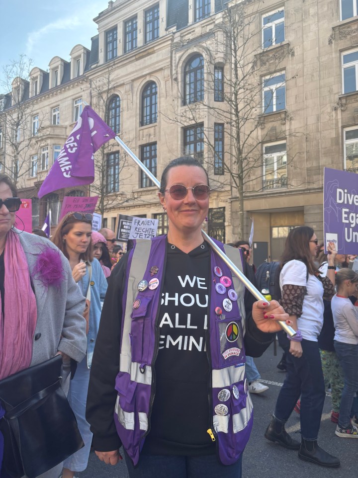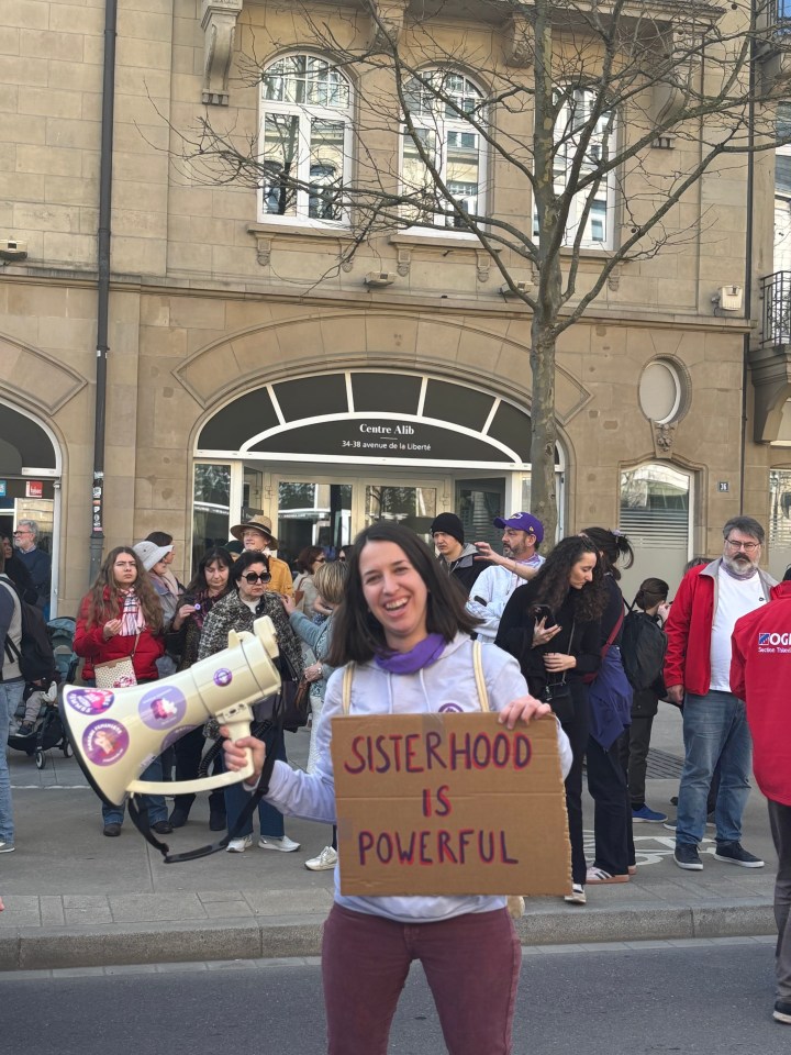 En s’approchant du cortège rassemblé à l’occasion de la journée internationale des droits des femmes, on observe des pancartes avec des messages aussi enflammés qu’originaux et on entend des chants féministes en toutes les langues. Depuis 2021, cette marche est organisée par la plateforme féministe luxembourgeoise JIF (Journée Internationale des Femmes), créée en 2011. Milena Steinmetzer, secrétaire centrale du département des femmes au syndicat OGBL, explique : « Cette marche représente toute la diversité du mouvement féministe, avec toutes les organisations différentes. On a quand même un but commun, et c’est ce qui fait notre solidarité, on est tous et toutes différent.es, mais on est tous et toutes ensemble pour les droits des femmes et pour que les femmes aient leur juste place dans la société ».