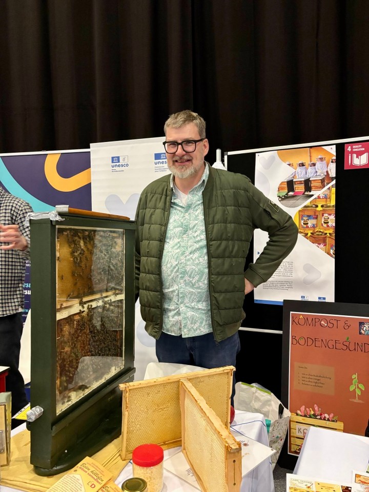 En plus des associations et des ONG présentes, plusieurs établissements ont également proposé des stands. Aletheia a interviewé Claude Hansen, professeur de biologie au LCD (Lycée Classique de Diekirch) depuis 2007. Apiculteur amateur, il s’occupe des ruches d’abeilles au LCD et à l’ancienne annexe, aujourd’hui l’école EIMAB à Mersch. « Fir äis Aussteller ass d’Vernetzung, déi ensteet, super. Mir léieren aner Leit kennen, mir léieren aner Projete kennen, mir gesi wat aner Leit um Terrain maachen a mir kënnen äis mat hinnen austauschen. »2 Par ces échanges, les exposants peuvent transmettre leur savoir aux autres, mais aussi en acquérir, dit-il, ce qui reflète aussi les comportements de la nature, avec la diversité d’espèces et les échanges entre celles-ci. Selon M. Hansen, il faut qu’on travaille ensemble et que tout le monde aide en faisant ce en quoi il est bon. « Zesumme si mer staark, zesumme packe mer dat. » 3 affirme-t-il.