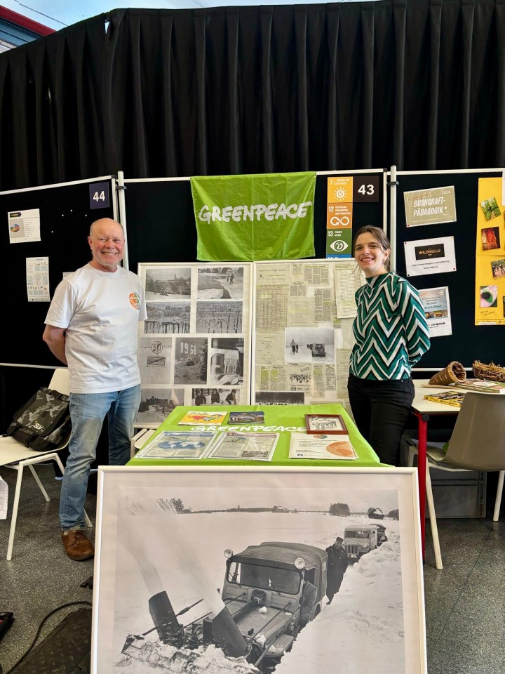 Aletheia a eu aussi la chance de s’entretenir avec les représentants de Greenpeace, une ONG internationale, ainsi qu’avec un membre de « Seniors for Climate Luxembourg », un groupe militant qui réunit des engagés de plus de 50 ans qui souhaitent montrer aux jeunes d’aujourd’hui l’importance de conserver notre planète à travers des photos de l’hiver des années 80 par exemple. Ils comptent 4 ou 5 membres actifs, et ils sont encore un groupe assez jeune, essayant pour l’instant de trouver des activités qu’ils pourraient proposer dans des écoles. Simon, un des membres engagés dans l’association dit: « What we have done is make a collection of photographs that date back to the 80s and 90s. We think it would be interesting for young people to see what winter was like before they were born, and it was indeed very different. »5 Il a montré plusieurs photos qu’ils avaient amené à la foire, comme une photo qui montre le niveau de neige tombé un hiver en 1980, ou encore la foule qui patinait à la Kockelscheuer: « And this is probably the most powerful picture: people skating on the lake in Kockelscheuer, almost every year. That hasn’t happened in about 20 years. »6 Ainsi, ceux qui n’ont pas vécu à cette époque ont la possibilité de se faire une image du changement climatique sur seulement quelques décennies.