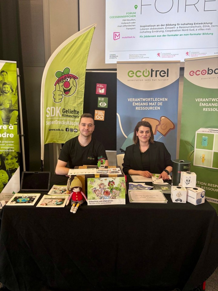 Certains organismes comme la SDK (Superdréckskëscht) ou la EBL (Ëmweltberodung Lëtzebuerg) se sont manifestés en tant qu’organismes luxembourgeois. La SDK agit beaucoup dans les écoles à travers des ateliers organisés pour les jeunes afin de les éclairer sur des thèmes tels que la protection de ressources, le changement climatique et tout ce qui se rapporte au thème du développement durable. « Et ass flott, dass alleguer d’Akteuren zesummekomme kënnen. Perséinlech fannen ech et e bësse schued, dass net méi Leit hei sinn, well et vill Aussteller ginn, déi interessant Saachen ze weisen hunn. Op jidde Fall fannen ech d‘Iddi vun der Foire wierklech super! »7 EBL de leur côté ont souligné la très grande offre présente à la foire, qui a pu être trop même pour le public qui est venu. En effet, cela pourrait être une bonne idée d’organiser une sorte de flyer qui regroupe tous les acteurs – organisations, écoles et associations – présents, afin que les personnes qui viennent à la foire aient une vue d’ensemble de la BNE.